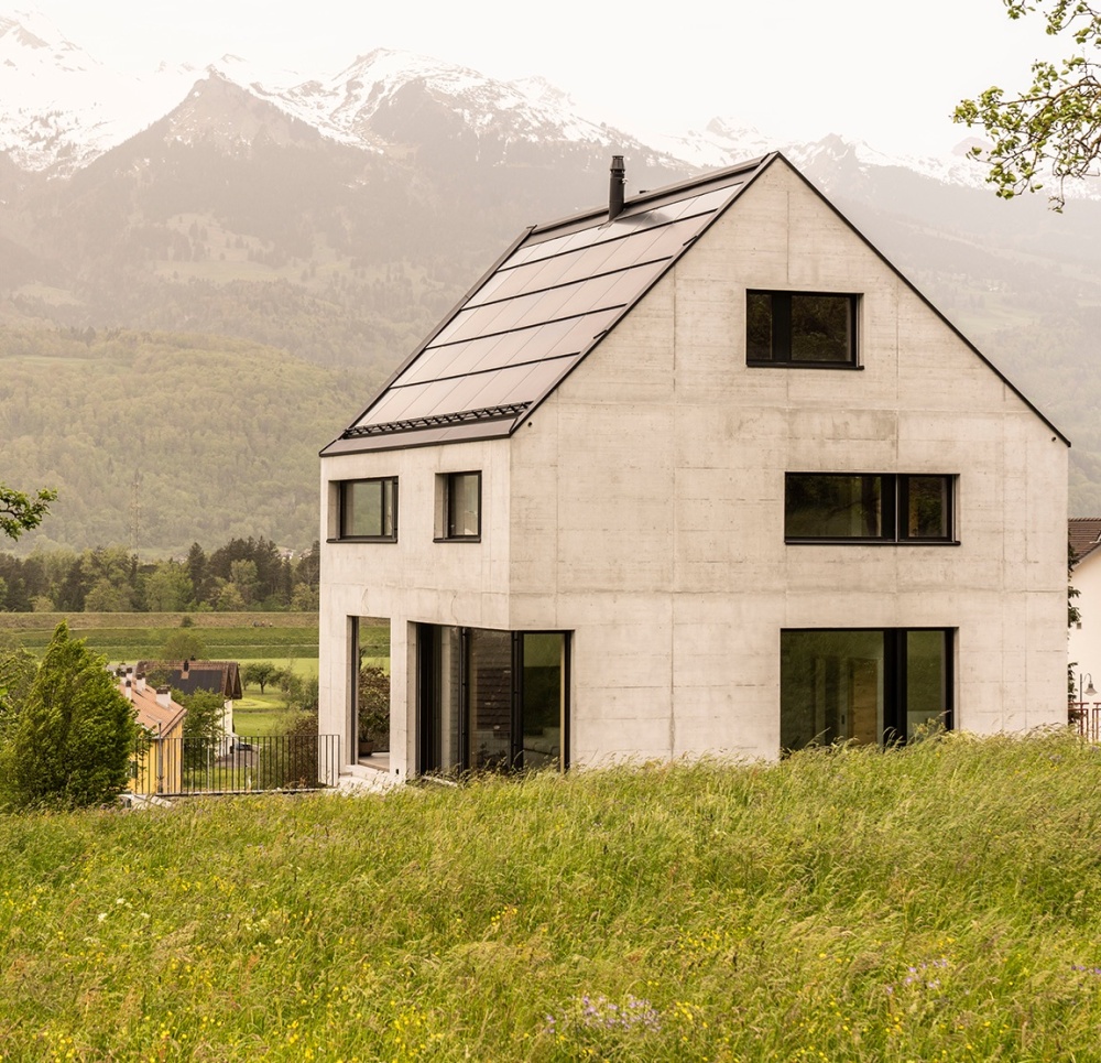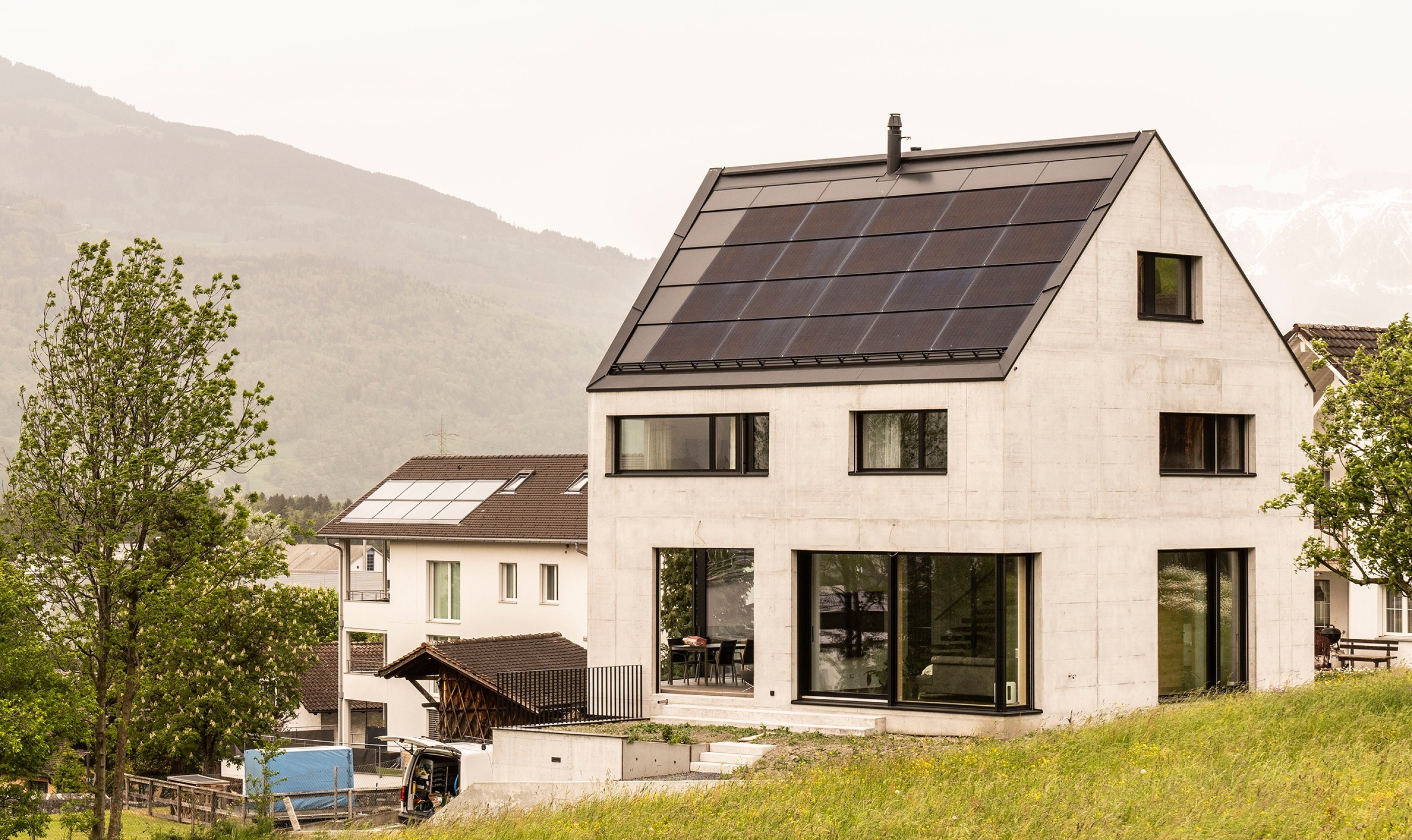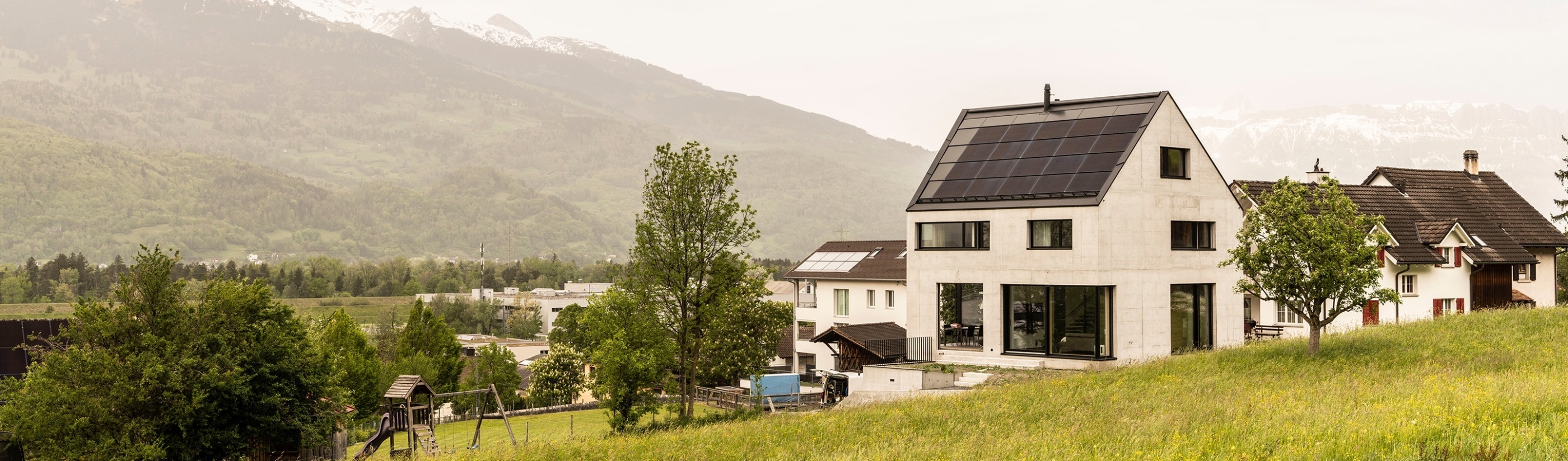 Auf dem Dach sorgt eine moderne Photovoltaik-Indachanlage für umweltfreundliche Energie. Die zeitgemässe Eindeckung und das schlichte, elegante Design passen perfekt zur modernen Architektur des Hauses.