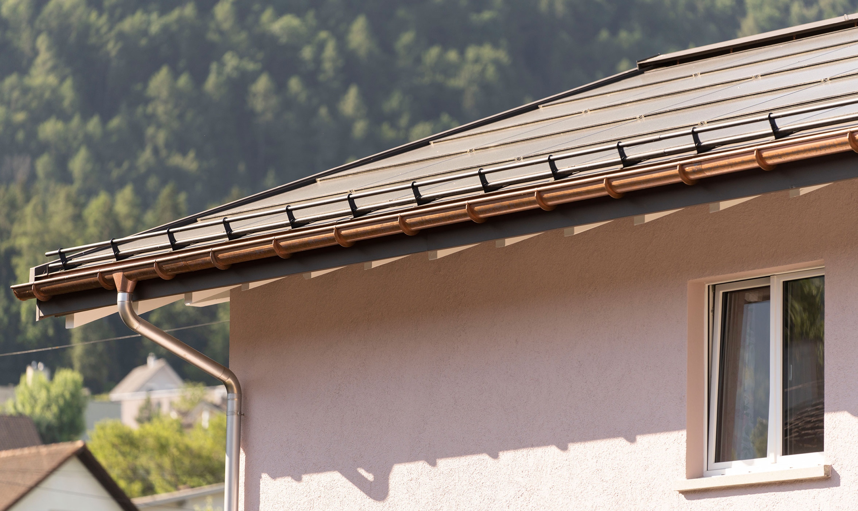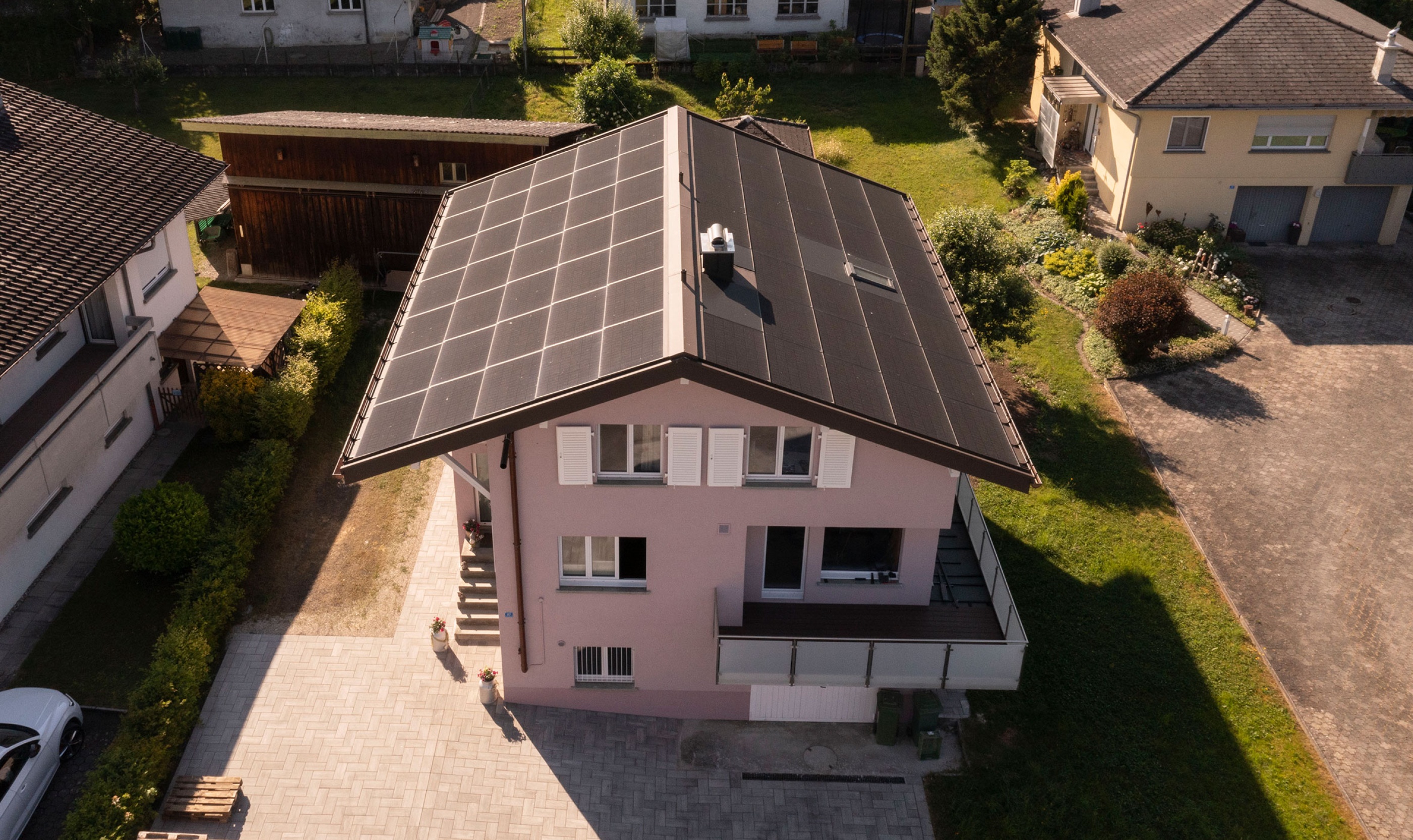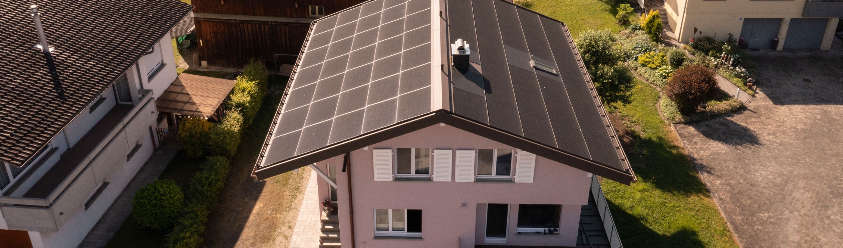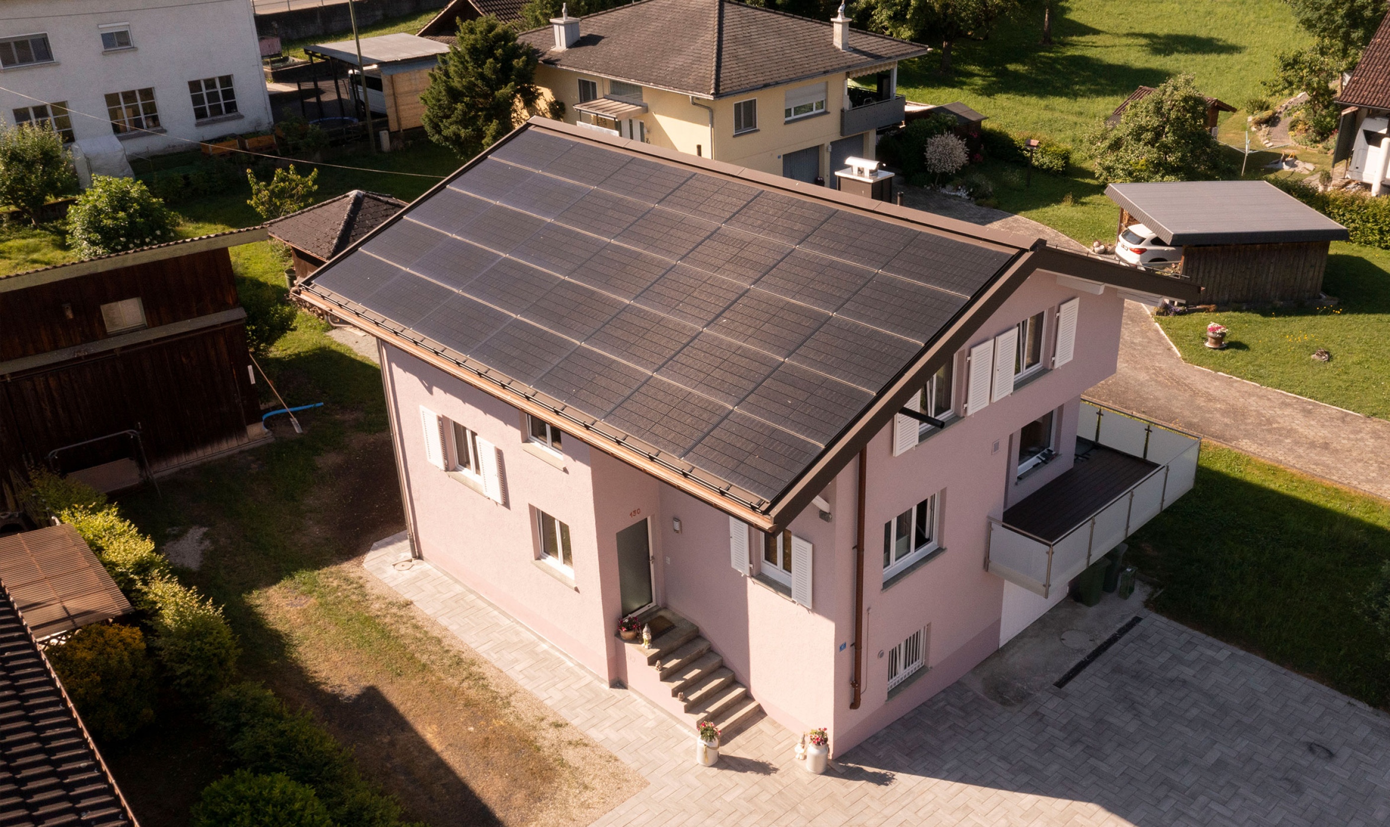 Ein zentraler Bestandteil des neuen Dachaufbaus ist die integrierte PV-Indachanlage. Diese besteht aus Solarmodulen, die direkt in das Dach integriert sind und somit eine ästhetisch ansprechende Lösung bieten. Durch die Solarmodule kann der Haushalt einen Grossteil des eigenen Strombedarfs decken und leistet einen aktiven Beitrag zum Klimaschutz.