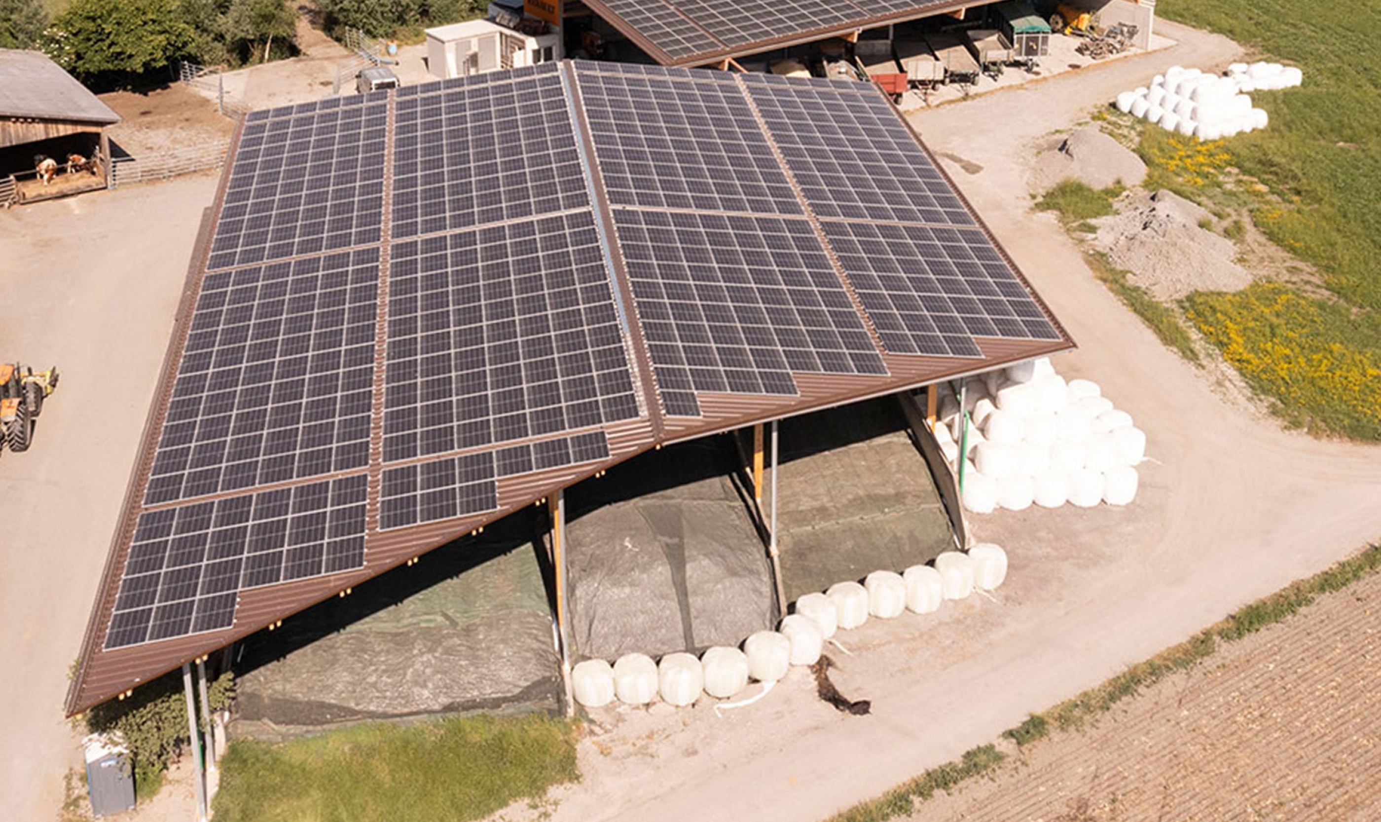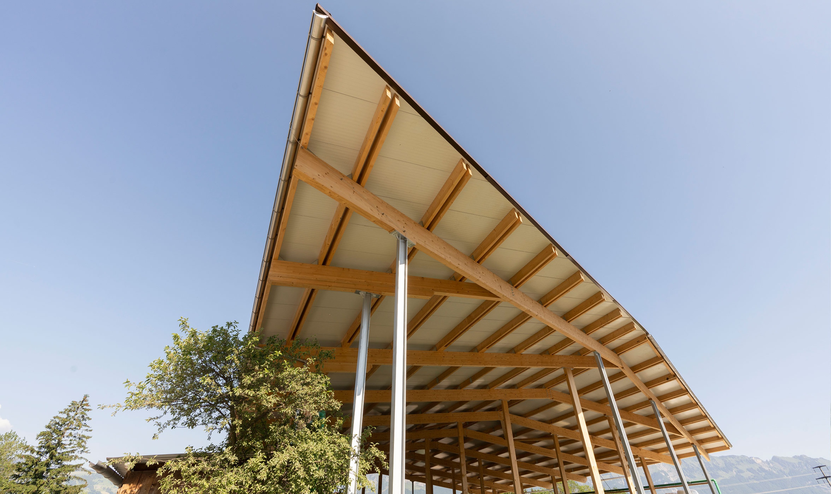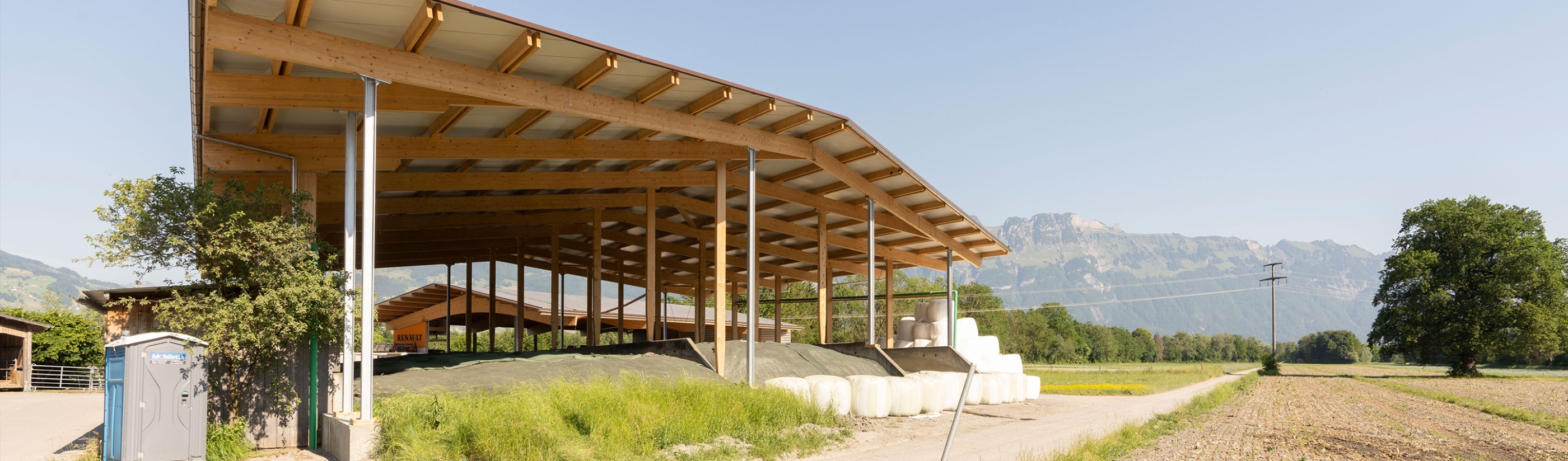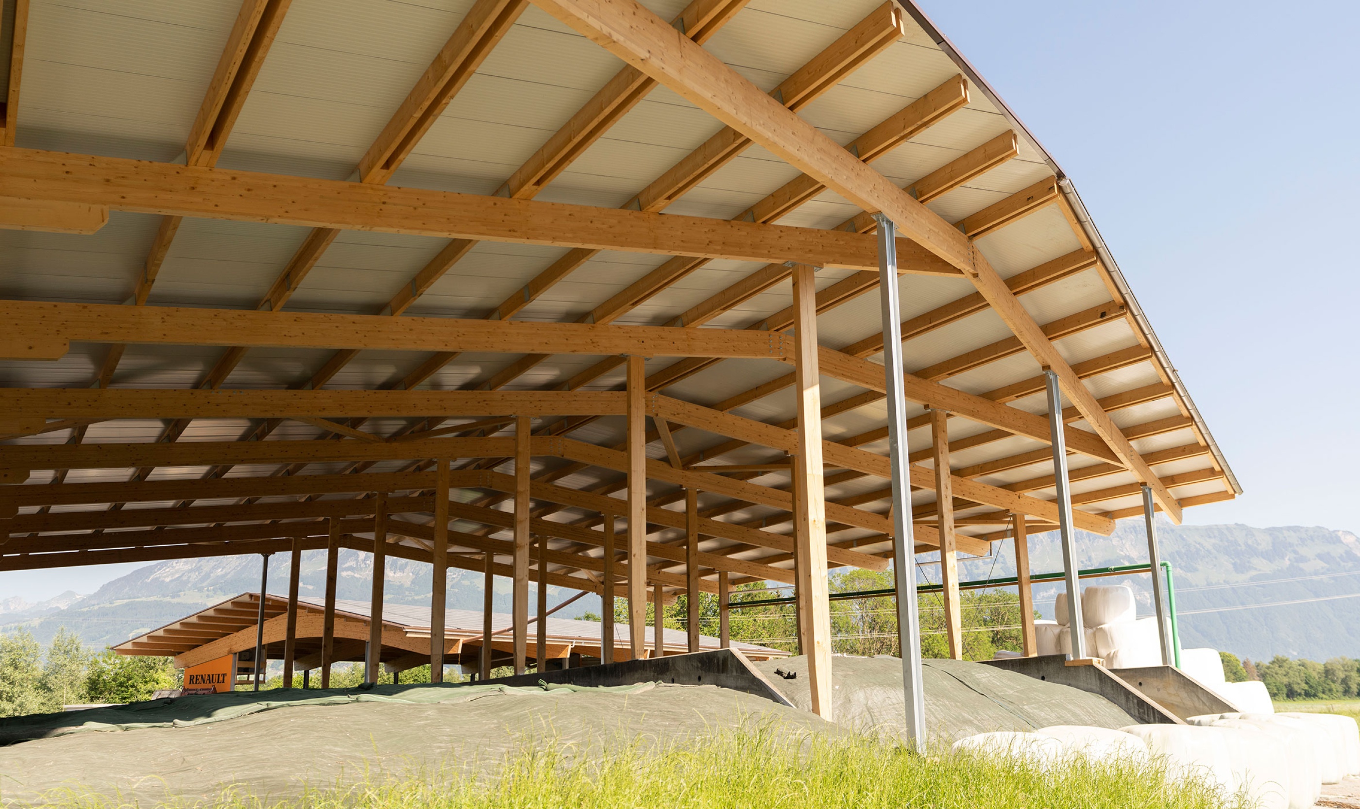 Die neugebaute Fahrsiloüberdachung haben wir komplett aus Holz errichtet. Dabei haben wir eine Dachfläche von 1350m2 mit Sandwichpaneelen eingedeckt. Der Vorteil von einer Fahrsiloüberdachung ist, dass der Bauer wetterunabhängig seine Fahrsilos füllen kann und diese nicht mehr abdecken muss. Dies spart nicht nur Zeit und Aufwand, sondern auch Kosten.