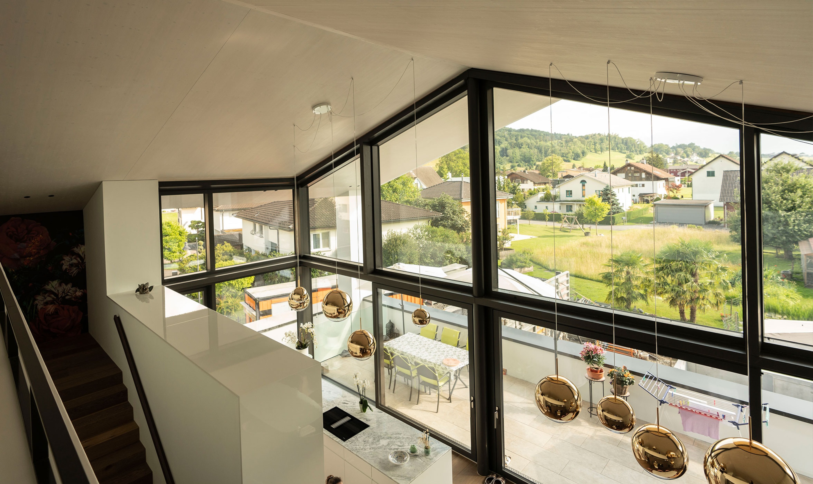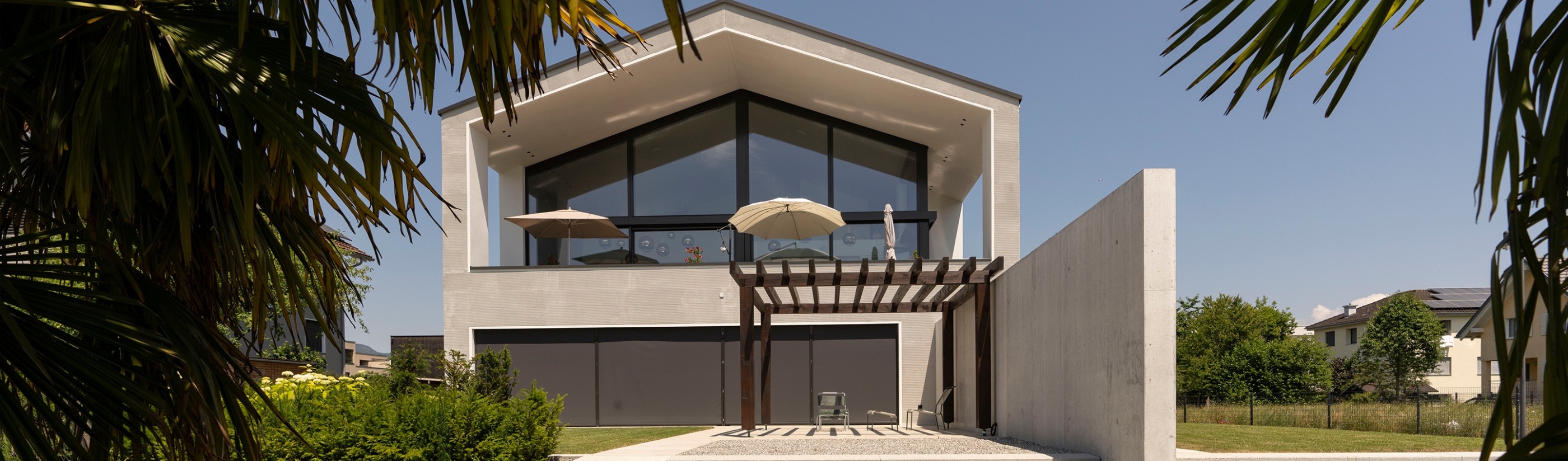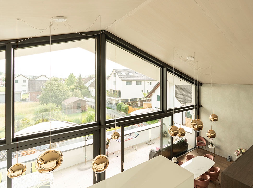 Die Dachkonstruktion von diesem Mehrgenerationenhaus haben wir mit vorgefertigten Dachelementen errichtet. Die Dachunterschicht besteht aus Fichtenplatten, die vom Maler weiss lasiert wurden. Als mittlere Schicht haben wir Zellulose verwendet, die aus recyceltem Zeitungspapier hergestellt wurde. Als Dacheindeckung wurde eine Photovoltaik-Indachanlage installiert. Diese Kombination ermöglicht eine effiziente Nutzung erneuerbarer Energiequellen und trägt zur Nachhaltigkeit des Hauses bei.