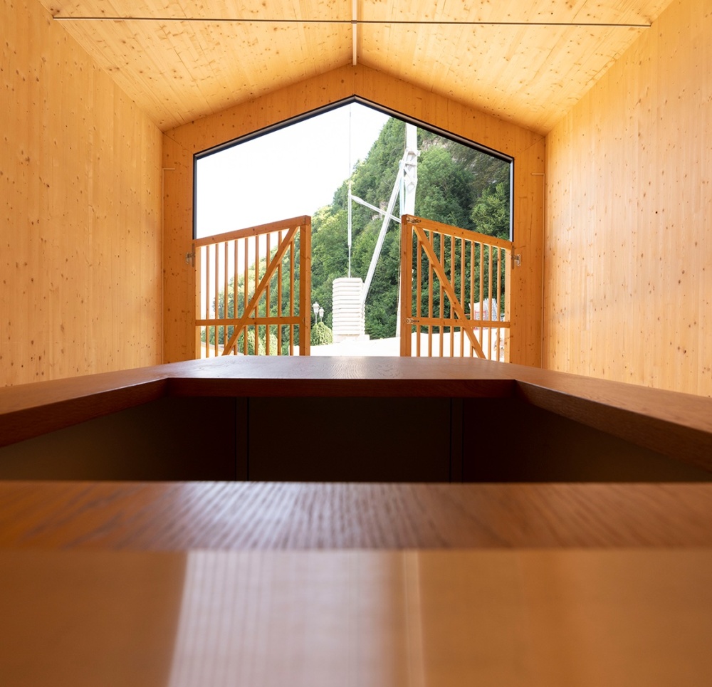 Die Wand- und Dachkonstruktion wurde aus grossflächigen Massivholzplatten aus Fichte gefertigt. Dieses temporäre Bauwerk bot den Besuchern während der Renovierung eine alternative Nutzungsmöglichkeit und präsentierte sich als stabile sowie ästhetische Lösung für die Übergangszeit.