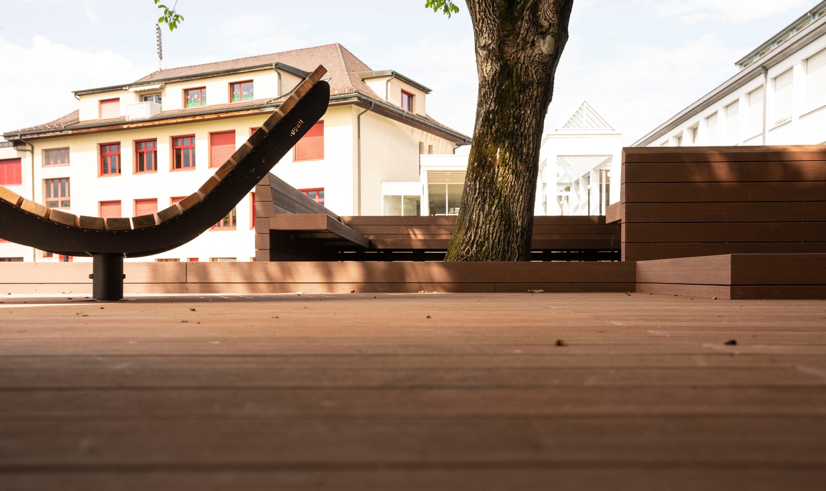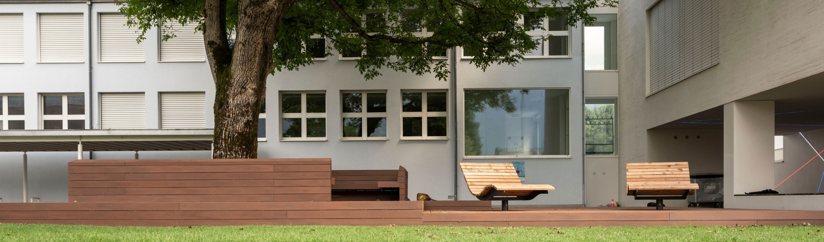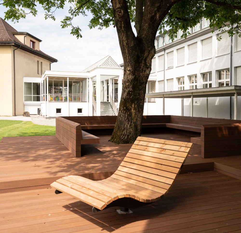 Für die Gemeinde Ruggell durften wir eine Sitzplattform errichten. Sie hat eine Größe von 9 x 15 Metern und verfügt über zwei Drehliegestühle als Highlight. Das Fundament besteht aus Krinner Schraubfundamenten. Der Bodenbelag hat die höchste Rutschklasse für öffentliche Bauten und besteht aus WPC Bodendielen, einem Holz-Kunststoff-Verbundwerkstoff. Diese Dielen sind sehr witterungsbeständig und nicht verrottbar. Mit der Zeit können nur minimale Farbänderungen auftreten. Die Dielen haben wir im englischen Verband verlegt. Sie wurden durch unsichtbare Klips befestigt. Die Unterkonstruktion besteht aus Aluminium und verzinktem Eisen.