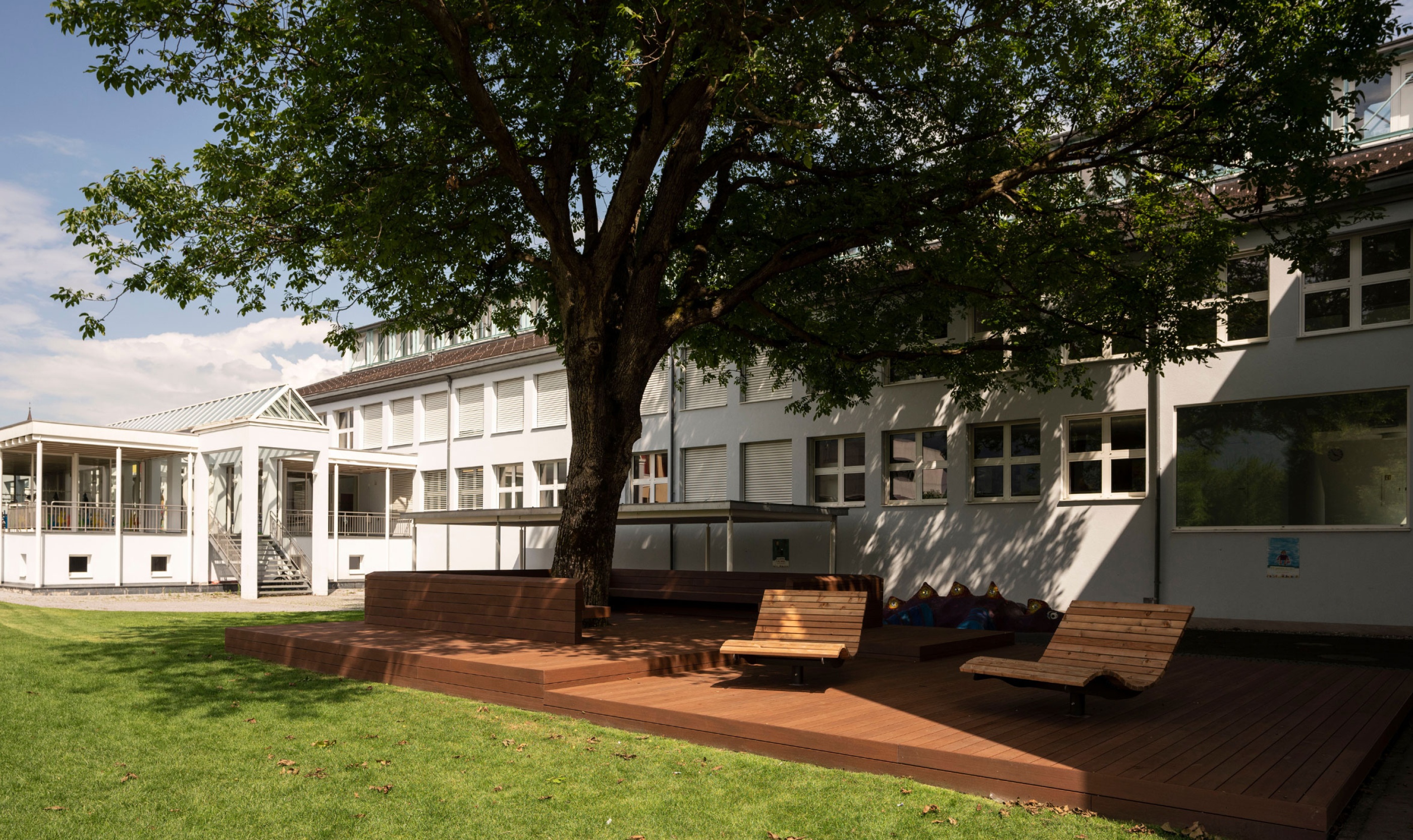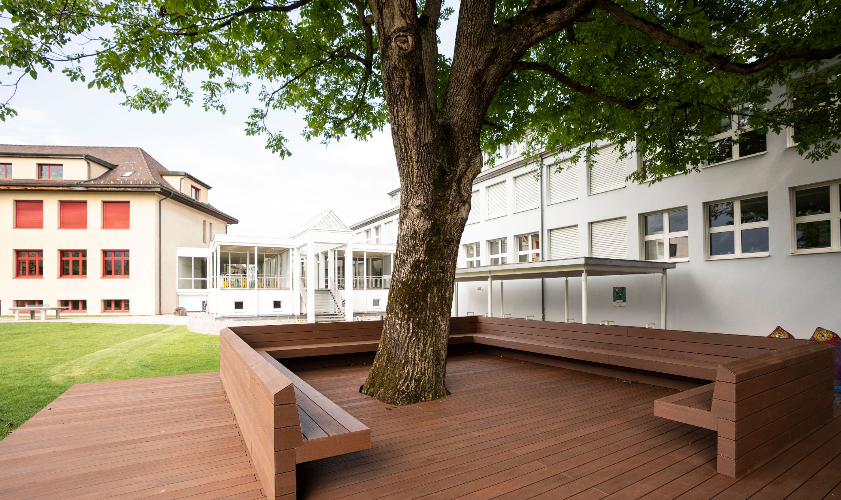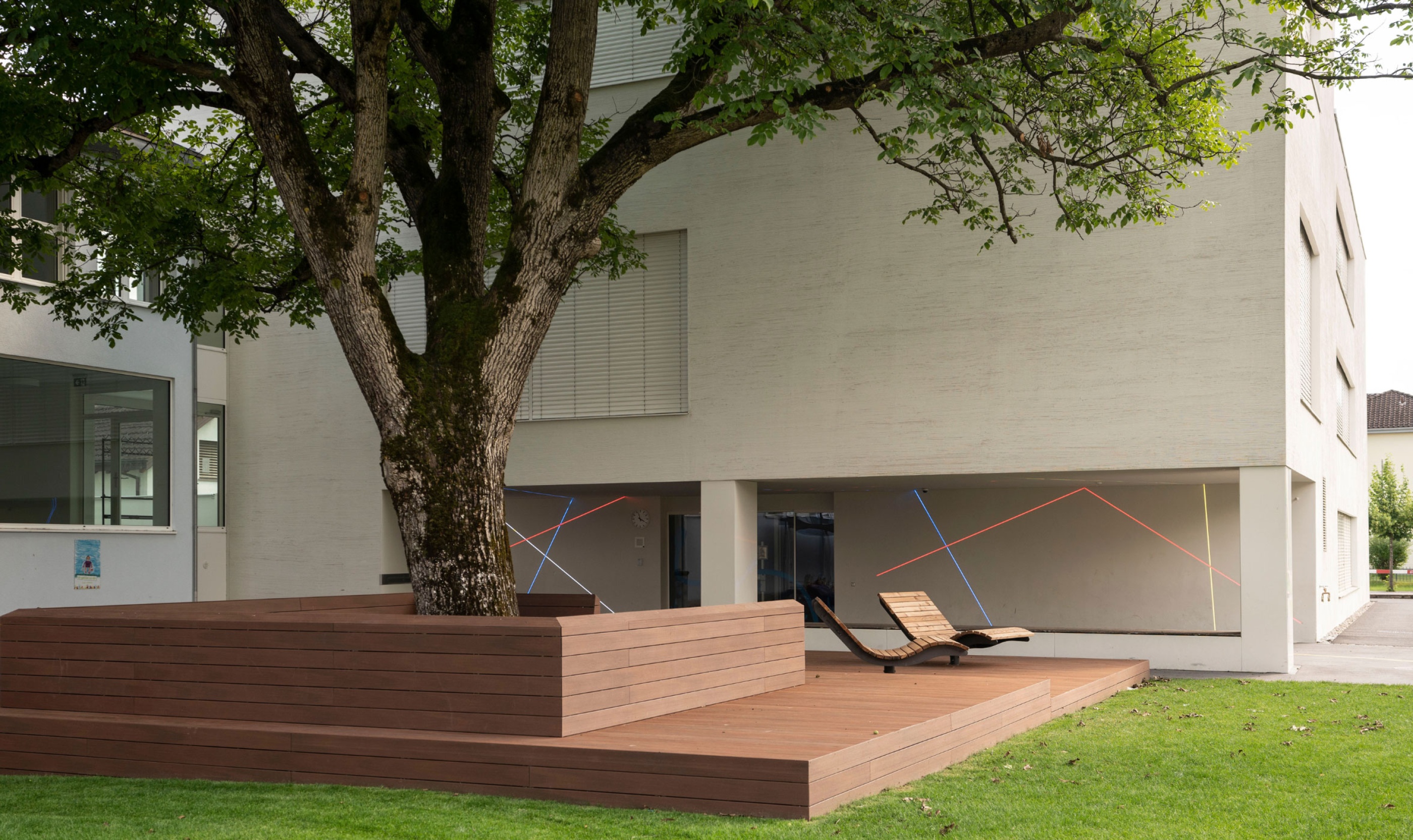 Für die Gemeinde Ruggell durften wir eine Sitzplattform errichten. Sie hat eine Größe von 9 x 15 Metern und verfügt über zwei Drehliegestühle als Highlight. Das Fundament besteht aus Krinner Schraubfundamenten. Der Bodenbelag hat die höchste Rutschklasse für öffentliche Bauten und besteht aus WPC Bodendielen, einem Holz-Kunststoff-Verbundwerkstoff. Diese Dielen sind sehr witterungsbeständig und nicht verrottbar. Mit der Zeit können nur minimale Farbänderungen auftreten. Die Dielen haben wir im englischen Verband verlegt. Sie wurden durch unsichtbare Klips befestigt. Die Unterkonstruktion besteht aus Aluminium und verzinktem Eisen.