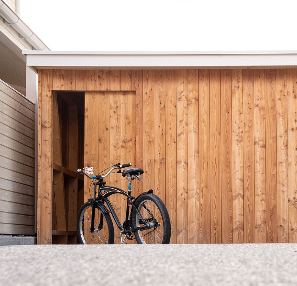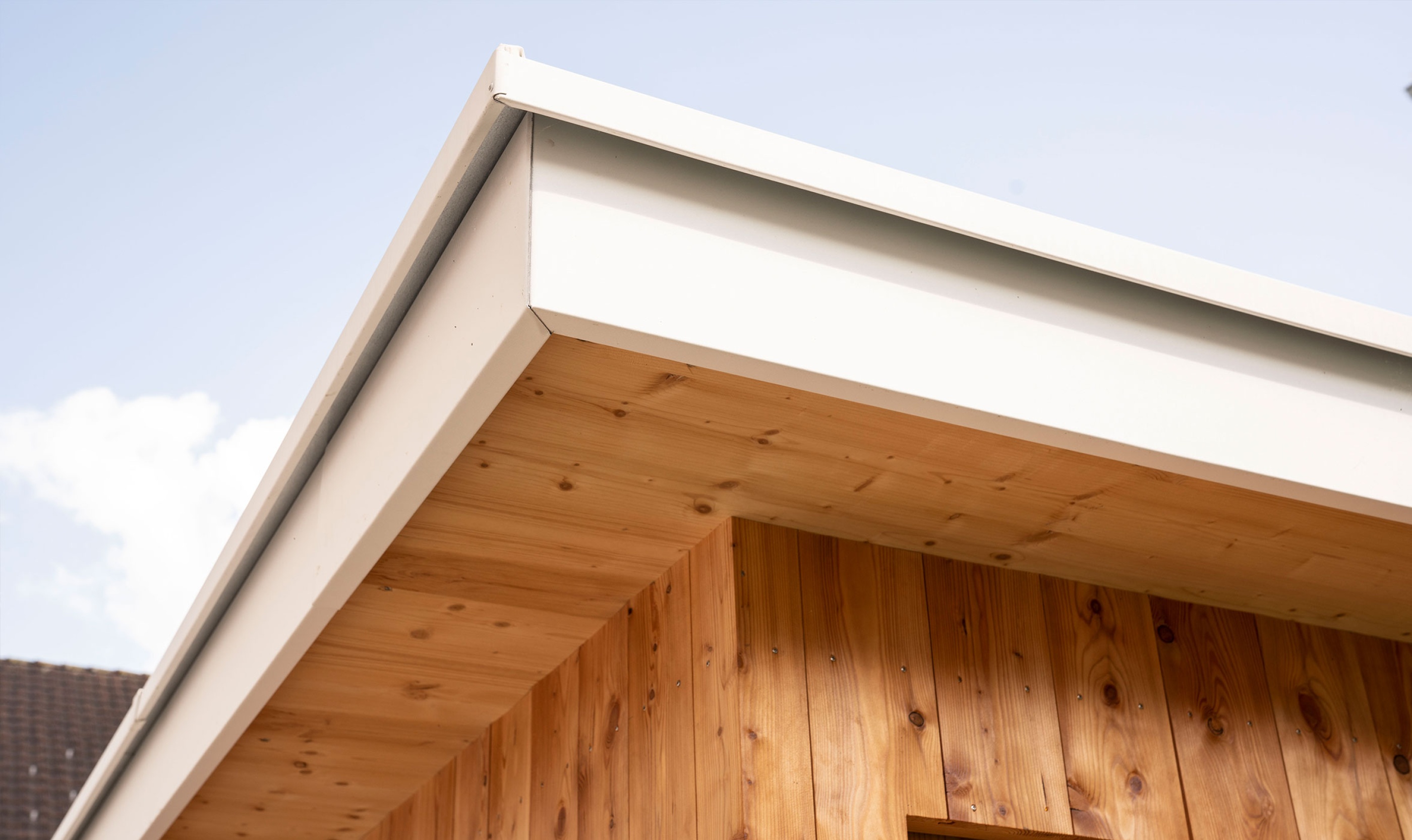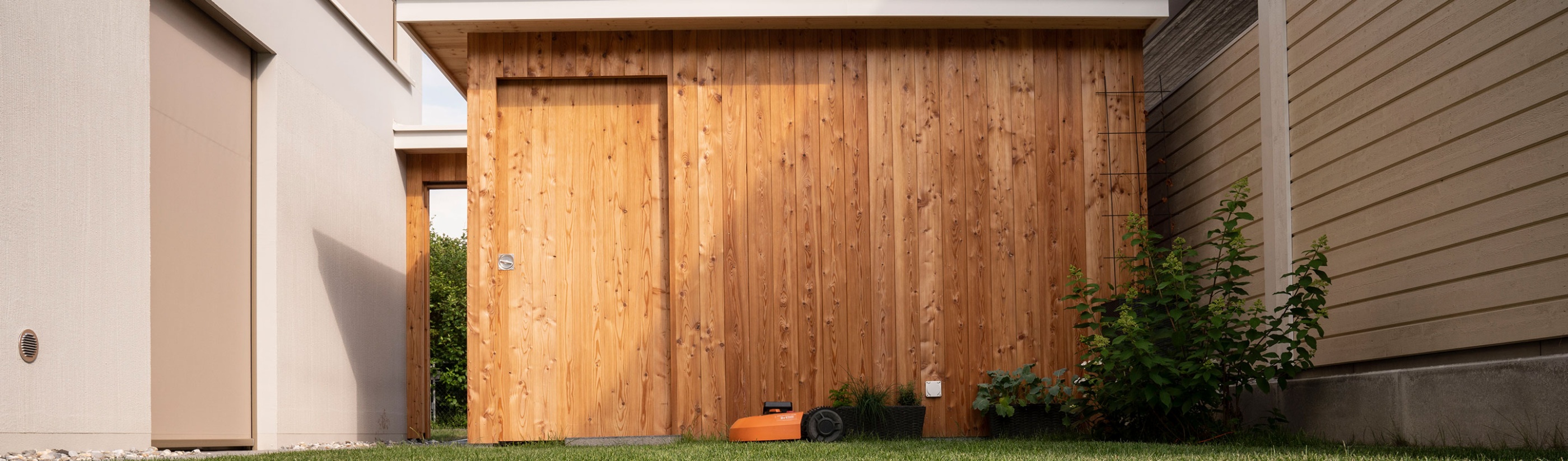 Dieser Veloschopf trennt den Garten vom Vorplatz und lässt dabei keine Wünsche mehr offen. Mit zwei Schiebetüren, die von der Strasse aus zugänglich sind, bietet der Schopf einen grosszügigen Abstellraum für Fahrräder. Zusätzlich gibt es eine Schiebetür auf der Gartenseite, die als Abstellraum für Gartengeräte dient. Die Holzkonstruktion besteht aus lokalem Massivholz und die Fassade haben wir mit Lärchenholz verkleidet. Dabei fügt sich das Flachdach architektonisch hervorragend in das Gesamtbild des Anwesens.